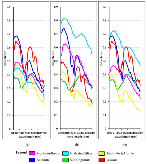 The three classification results in Figure 10 were generated with the SAM while using the extracted libraries and manually set classification thresholds (Table 2). Several differences among these three classification results can be observed. For instance, 200,560 pixels in Figure 10b were identified as hydrated silica, while only 45,704 pixels in Figure 10a and 123,656 pixels in Figure 10c were identified as hydrated silica. Similarly, 194,416 pixels in Figure 10c were identified as alunite, while 121,578 pixels in Figure 10a and only 20,300 pixels in Figure 10b were identified as alunite.