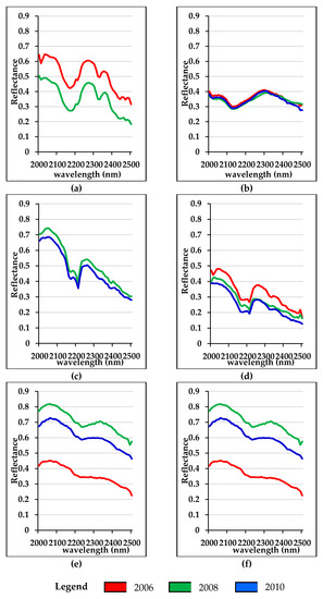 Comparison of spectra from three images for each of the six minerals: (a) Alunite; (b) Buddingtonite; (c) Kaolinite; (d) Kaolinite and Alunite; (e) Hydrated silica; (f) Montmorillonite. In (a,c), the spectra from 2006 and 2010 image are overlapping.