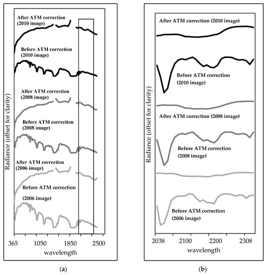 (a) shows the comparison of overall spectra (400–2500 nm) derived from the three images before and after the atmospheric correction; (b) subset of the spectra in the black outline of figure (a) which is the comparison of spectra of wavelength range 2048–2308 nm that hosts diagnostic spectral features of the targeted mineral classes.