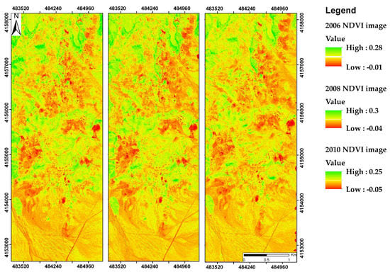 Normalized difference vegetation index (NDVI) images derived from (a) the 2006 image; (b) the 2008 image; and, (c) the 2010 image.