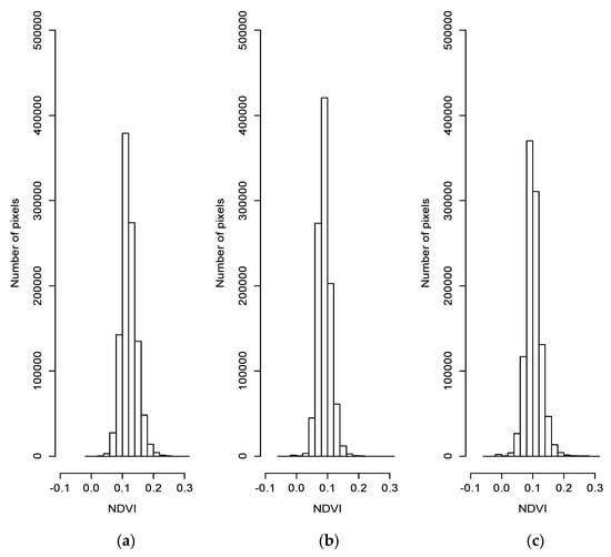 Histograms of NDVI values in (a) the 2006 image; (b) the 2008 image; and, (c) the 2010 images.