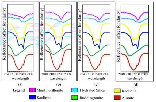 The atmospherically corrected images were subset spectrally and spatially for subsequent processing. For three reasons, the images were spectrally subset to a 2048–2308 nm wavelength range. First, we focus on minerals whose diagnostic absorption features are located in the short-wave infrared (SWIR). Second, bands that were shorter than 2048 nm were influenced by atmospheric absorption around 1900 nm. Third, the diagnostic absorption features of all six mineral types referred by Swayze et al. [23] are all in a 2048–2308 nm wavelength range (as shown in Figure 3 and Figure 4). Apart from the spectral subset, all three images were spatially limited to the eastern alteration center (the red box in Figure 1).