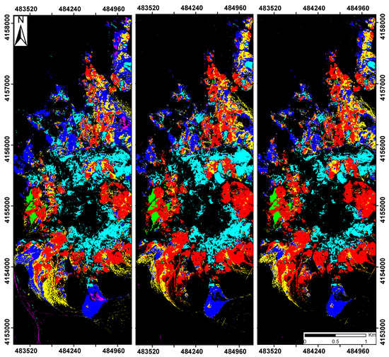 We applied masking [47] to create maps with a single mineral class for comparing the classification results on a mineral-by-mineral basis (single-mineral map). With six mineral classes in six classified images, 36 single-mineral maps were produced in total (shown in Supplementary Materials: Figure S1–S36).