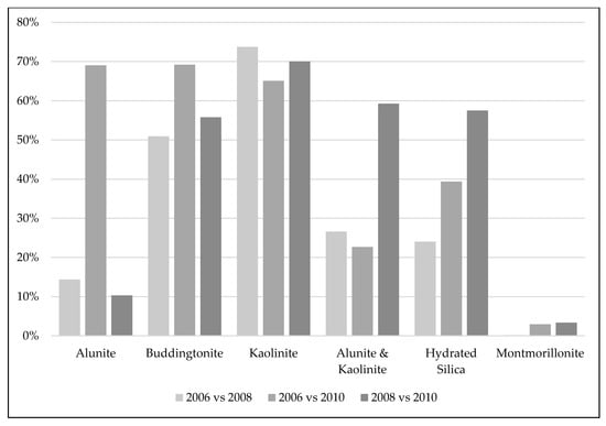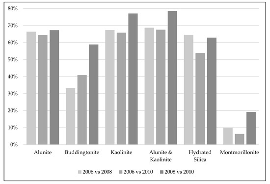 Figure 12 presents the consistency of the SAM classification results that were obtained using the three extracted endmember libraries. Kaolinite shows a consistency of approximately 70% over all three classification results. Alunite shows a consistency of approximately 70%, but only between the 2006 and 2010 images, while between the 2006 and 2008 images as well as the 2008 and 2010 images is only of approximately 10%. The consistency of other classes in Figure 12 also vary following the conversion of compared results and show consistency of 0.16–50% over all three classification results. Figure 13 displays the consistency of SAM classification results produced while using averaged endmember library. Montmorillonite shows a consistency of 6–19% over the three classification results. Buddingtonite shows a consistency of approximately 30% between 2006 and 2008 images, 40% between 2006 and 2010 images, and 60% between 2008 and 2010 images. The other classes show a consistency of approximately 60–80% over all three classification results.