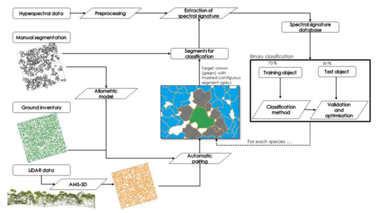 We assessed the effectiveness of adding SWIR bands to the VNIR spectrum. We used manual segmentation data and we selected the 20 most abundant tree species (Figure 3, 1). The same pixels were used to build training and test sets (70%–30%) for VNIR and VSWIR data. For this first experiment, none of the three classification methods were subject to secondary optimization.