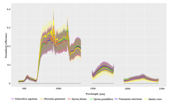 Normalized mean reflectance spectra (and standard deviation) for six focal species estimated on manually segmented crowns.