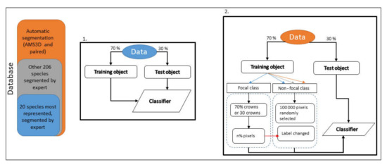 We present four different experiments. All classifiers considered in this study were binary classifiers; i.e., a particular focal species is classified against a large set of non-focal species. As a rule, we separated the data into 70% of the crowns used for the training set and 30% for the test set (Figure 3) repeating the operation 30 times. We provide the mean and the standard deviation of the F-measure.
