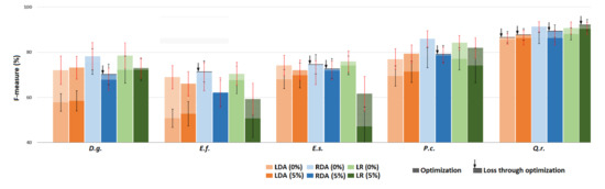 A labeling error of 5% did not affect LDA, with or without an optimization step. However, the optimization step was very beneficial in both cases. RDA was mildly affected by labeling error and not improved by optimization. LR classification method was much more impacted by a 5% error level and the optimization only partially compensated for this. The average loss in F-measure was 11.8% (without optimization) and 6.7% (with optimization). More complete results on the average F-measure, with or without an optimization step are provided in Appendix B, including results obtained for 2% bias.