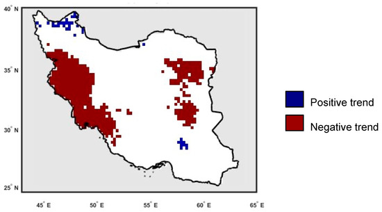 Figure 2 shows the spatial distribution map of annual precipitation trends using the PERSIANN-CDR estimates for the period from 1983 to 2018. In this figure, the statistically significant (95%) positive and negative trends are in blue and red, respectively, and non-statistically significant trends are shown in white. There are limited numbers of pixels showing statistically significant changes in the annual precipitation over Iran. The annual precipitation decreased in the western (including Khuzestan, Ilam, Lorestan, Kermanshah, Hamadan, and Kurdistan provinces) and eastern (including some regions over Khorasan-jonoubi, Kerman, and Razavi Khorasan provinces) regions. On the other hand, the annual precipitation has increased significantly in small regions of northwestern Iran (including some area around Ardabil) and in a few pixels in the central part of the country.