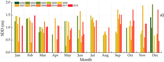 In contrast, the estimations for the rest of the years have recognizable patterns with high clarity in dry seasons and low clarity during rainy periods. Valle de Bravo experienced the highest transparency during the years of 2004, end of 2007, 2010 and 2012 throughout the period of November reaching peak values in Dec 2004, Sep and Nov 2007 and Dec 2010. During Jan and Nov 2008 high Turbidity is observed, atypical even for other records of years. Recovery was visible from May 2010 and continued with higher SDD during 2012. A further analysis of SDD values per each month during the complete timeframe is shown in Figure 10a. Each year is also displayed with the corresponding months in Figure 10b. Similarly, Figure 10c,d show the Turbidity values per month and year.