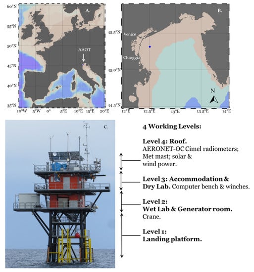 (A) Map showing the location of the Acqua Alta Oceanographic Tower (AAOT) in Europe and (B) in the Northern Adriatic Sea; (C) schematic of the AAOT. For the intercomparison, the radiance sensors were located on the deployment platform on level 3, on a 6 m pole that raised them above the solar panels on level 4. A telescopic (Fireco) mast for the irradiance sensors was located in the eastern corner of level 4.