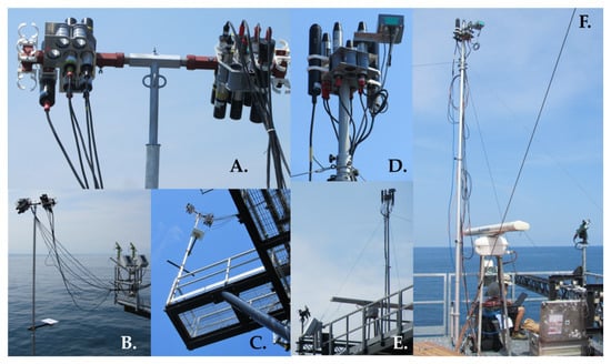 All above-water radiometers except the PANTHYR system were located on the same purpose-built frames (Figure 2). The radiance sensors were located on the western corner of the AAOT and irradiance sensors and PANTHYR system were located at the eastern corner. For the radiance sensors, the frame was constructed to position the sensors side by side and at the same height (Figure 2A). The frame was fabricated from aluminium at a height of 12.3 m from the sea surface. All and sensors had the same identical viewing zenith angles of θ = 40° and θ′ = 140°, respectively. A sundial was located mid-way down the mast of the frame with a vertical bar to turn it to the correct Δϕ (Figure 2B,C). The deployment frame was adjusted for each measurement sequence so that Δϕ = 135° or Δϕ = 90°, which are typically used to reduce sun glint [18]. The radiance mast was positioned at the same level as the SeaPRISM system (Figure 2B,C). The base of the mast was attached to a foldable knuckle joint so that the frame could be lowered, allowing for daily cleaning and servicing of the sensors. For irradiance measurements, a telescopic (Fireco) mast was used to minimize interference from the tower super-structure and other overhead equipment which was installed at a height of 18.9 m above the sea surface (Figure 1C, Figure 2E,F).