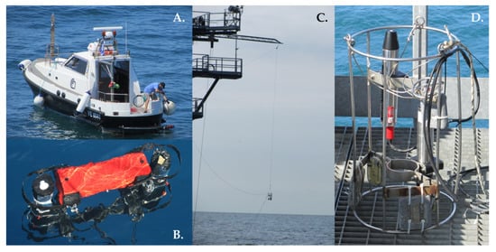 In-water sensors (A) C-OPS being deployed from RV Litus, (B) positioning of C-OPS in-water, (C) in-water TriOS deployment from an extendable boom on the AAOT, (D) TriOS in-water irradiance sensor in metal deployment frame.