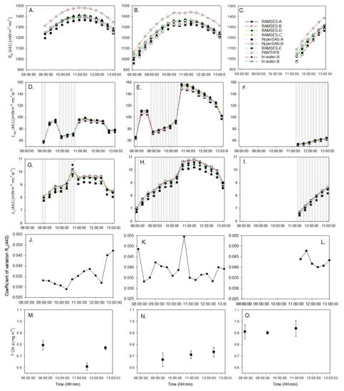 The variability in , and for the days and casts used in the intercomparison are shown in Figure 4. The criteria for selection of data used in the intercomparison was a smooth signal, indicating the absence of clouds (see also Appendix A1 for variability of these parameters on cloudy days and Figure A2 and Figure A3 for fish eye images on 13 and 14 July to show the cloud-free sky conditions). Although the conditions were clear, there were some fairly large variations in . On 13 July the variation in was 40% and on 14 July it was 57%, with the largest changes at 09:20 and 10:40, respectively (Figure 4D–F). The variations in were partly due to temporal changes in sky conditions and partly due to using either 90° or 135° viewing angles (shaded areas in Figure 4D–J indicate 135° viewing angles). was always higher for both RAMSES and HyperSAS sensors (see Figure A4) with viewing angles of 90°. For example, on 14 July the viewing angle at 10:20 was 135° and was changed to 90° at 10:40. Changes in were more uniform, indicating lower variability of in-water conditions except at 10:20 on 13 July and 10:40 on 14 July, when the changes were 20% and 35% of early morning values, respectively. Again were consistently higher using viewing angles of 90° compared to 135° (Figure A4). The variation in at 10:40 on 14 July co-varied with , but at 10:20 on 13 July and diverged even though the sky conditions were similar (Figure A2), possibly due to a sea surface microlayer slick. On 13 July from 12:20 to 12:40 there was a decrease in , due to a change in the viewing angle from 90° to the right to 90° to the left. Prior to 17 July there was a storm and rain on 15 and 16 July, which may change the atmospheric aerosol type and in-water conditions on 17 July, compared to those on 13 and 14 July. To further assess whether the variation in on 13 and 14 July reduced the quality of the radiometric data used in the intercomparison, across-group coefficient of variation in from the above-water systems on 13, 14 and 17 July are also presented in Figure 4J–L. The change in viewing angle from 90° to 135° and co-varying temporal changes in , and cancel out when computing (e.g., Figure A5 and Figure A6). The coefficient of variation, therefore, represents temporal changes in both in-water constituents and the bi-directionality of the light field. This varied from 0.029 to 0.055, with the highest value recorded on 13 July at 10:40 when there was a decrease in and increase in . Despite the relatively large variations in , the coefficient of variation in was <5.5% across above-water systems, indicating that the observed variability in was not introducing large variations in . Comparison of variations in , and during cloudy conditions on 15 and 16 July 2018 are given in Figure A1. These data were not used for the intercomparison, but illustrate that under non-ideal conditions there are larger variations in both , and .