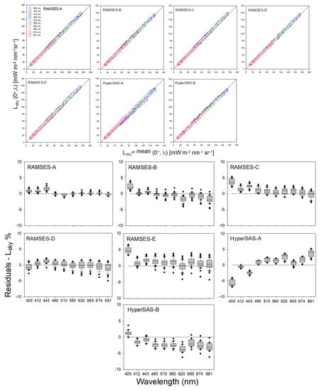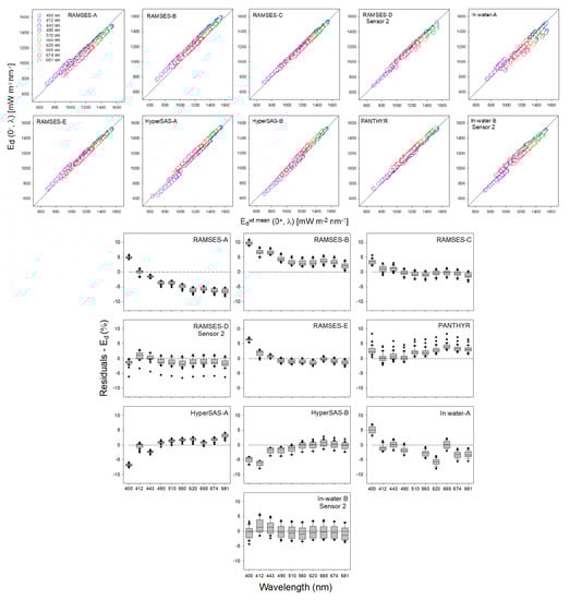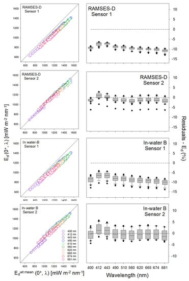 The intercomparison results of and the corresponding residuals are shown in Figure 5 and the statistics are given in Table 4. There was good agreement between the TriOS-RAMSES above-water systems, with an RMS <0.03 mWm−2nm−1 across the visible spectrum and with most sensors having an RPD <5% (with some exceptions; e.g., RAMSES-A >5% at 665 nm; RAMSES-B > 6.5% at 443 nm; Table 4). There was a tendency for RAMSES irradiance sensors to over-estimate at 400 nm relative to the weighted mean, which was highest for RAMSES-B (Figure 5). RAMSES-A tended to under-estimate in red and green channels. There was a systematic bias in the RAMSES-D and in-water-B Sensor 1 data, compared to the weighted mean, whereby all channels were underestimated by >5% varying from ±7.9% at 443 nm to ±10.6% at 665 nm. This bias was due to poor cosine response of the sensor. To correct for this, from the RAMSES-D sensor 2 were processed for both RAMSES-D and in-water B data, which significantly reduced the differences against the weighted mean (Figure 6, Table 4). Due to the problems discovered with RAMSES-D and in-water B Sensor 1 data, only the corrected data using Sensor 2 are therefore plotted in Figure 5. The two Seabird-HyperSAS irradiance sensors exhibited an RMS of <0.01 mWm−2nm−1 across the visible spectrum which was higher in the blue. Both in-water systems measured above-water, but tended to underestimate . The in-water A system was within <3% at 443, 560 and 665 nm (Table 4), although it exhibited high scatter at 400 nm (Figure 5).
