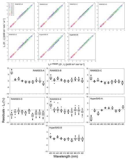 In-water methods to estimate water-leaving radiance require the measurement of the nadir upwelling radiance, , or upwelling irradiance, , as a continuous profile in the water column or at several fixed depths. The first type of measurement is generally performed with free-fall profilers deployed from a ship [22] or autonomous profiling floats [23]. The second type of measurement is generally performed with optical moorings [24], surface buoys [12] or when instruments have to be lowered manually in the water column [25] from a variety of platforms. Each method has its pros and cons, however all of them have a few principles in common to improve the accuracy of estimating . These include a sufficient number of vertical or temporal measurements to reduce the effect of wave focusing, minimize the effect of instrument self-shading, platform shading and reflection, so that the measurements can also be made as close as possible to the surface and at nadir view. is then used to extrapolate the radiometric quantities to just below the water surface (0−) since this cannot be directly measured due to wave perturbations. Although linear extrapolation of log transformed radiometric quantities is the most commonly used technique, this is not always an ideal approach depending on the type of measurements, environmental conditions and wavelength. Finally, the is projected above water to obtain the water-leaving radiance: