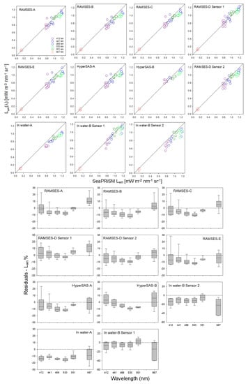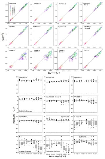 Top Panel: Scatter plots of for each cast from the different above- and in-water systems versus weighted mean () from above-water systems (RAMSES-A, -B, -C, HyperSAS-A, -B). The different coloured points correspond to the different Ocean and Land Colour Instrument (OLCI) bands given in the RAMSES-A sub-plot. Bottom Panel: residuals of from each cast expressed as percent residuals for the different above- and in-water systems. The residuals at each wavelength are calculated for each system as [( − )/]∗100. The weighted mean from above-water systems (RAMSES-A, -B, -C, HyperSAS-A, -B), is given as the dotted line. The boundary of the box closest to zero indicates the 25th percentile, the solid line within the box is the median, the dashed line is the mean and the boundary of the box farthest from zero indicates the 75th percentile. The error bars above and below the box indicate the 90th and 10th percentiles and the points beyond the error bars are outliers. For RAMSES-D and in-water B data from Sensor 2 are shown.