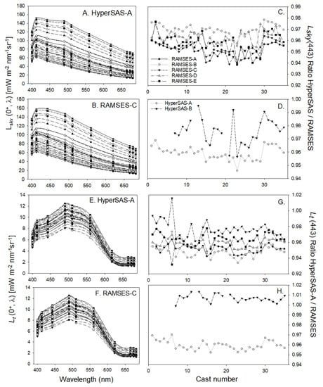 For RAMSES-E, full details of the data processing are described in [44] and associated appendices. In brief, once the data were exported from the TriOS software, in-house Python scripts were used to implement several quality checks (QC), where a spectral scan was discarded if it met any of the following criteria: (a) inclination of the irradiance sensor exceeds 5° from the vertical, (b) , or at 550 nm differ by more than 25% from either neighboring scan, (c) / > 0.05 sr−1 at 750 nm (indicating clouds either in front of the sun or in the sky-viewing direction), or (d) the scan spectra is incomplete or discontinuous (occasional instrument malfunction). Once all scans for a given cast were processed through QC, only the first five scans (relative to the start time of the station) that had complete spectra for all three of , and were used for further processing. From these data, “uncorrected” water-leaving radiance reflectance, , was calculated for each wavelength and for each of the five scans using Equations (1) and (3) above (with the distinction that is equal to multiplied by a factor of π). A simple quadratic function of wind speed for was used as approximation of the LUT of [18]. Minimization of perturbations due to wave effects was achieved through the turbid water near-infrared (NIR) similarity correction (Equation (8) in [43]). This was applied to by determining the departure from the NIR similarity spectrum with: