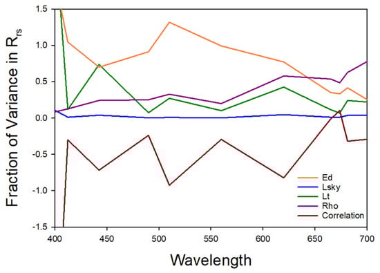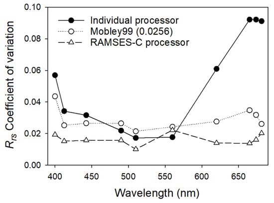 and scans with >25% difference between neighbouring scans at 550 nm were removed as well as any scans with incomplete spectra. scans were removed using the same criteria after normalizing by cos(), where is the sun zenith angle. The data are further processed if a sufficient number of scans passes the quality control criteria: for this is 9 of the possible 11 scans, and for and this is 5 of the possible 6 scans. The remaining and measurements are then grouped and mean-averaged. For each scan, (Equation (1)) is computed by removing sky-glint radiance using the look-up table (LUT) given in [18]. Wind speed was retrieved from ancillary data files in this intercomparison, but can alternatively be set to a user-defined default value if wind speed data are unavailable. The data in the LUT are linearly interpolated to the current observation geometry and wind speed. The scans are then converted into “uncorrected” water-leaving radiance reflectance scans and NIR similarity spectrum correction is applied to remove any white error from inadequate sky-glint correction, following the “RAMSES-E” TriOS Data Processing sub-section in Section 2.8.1 above. The final quality control to retain or reject the NIR corrected spectra, , is performed according to Ruddick et al. [44]. Measurements were rejected when / >0.05 sr−1 at 750 nm (indicating clouds either in front of the sun or in the sky-viewing direction), or when the coefficient of variation (CV, standard deviation divided by the mean) of the scans was >10% at 780 nm.
