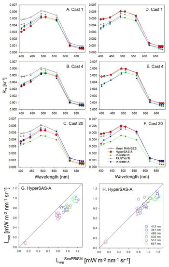 RAMSES-C measurements were conducted in “burst mode” over the common 5 min casts which typically gave between 100 and 140 spectra. All spectra were used for averaging and determination of standard deviation; no flagging was applied (visual quality control confirmed expected natural variability for clear sky conditions). Both radiance spectra, and , were interpolated to the wavelengths of . The factor of Mobley [18] with roughness-considerations of Hieronymi [41] was used. The observed wave height was used to estimate the actual sea surface roughness [41]. If the observed significant wave height, Hs, was smaller than 0.5 m, “wind speed” was reduced by 30% and the rounded values were used to select from Mobley’s look-up-tables (LUT) [18]. The usage of Mobley’s ρ follows the rationale and comparisons of Zibordi [52] for this setup and conditions. According to the institute’s protocol however, different sea surface reflectance factors are used to estimate uncertainties in the determination of . These reflectance factors are taken from the LUT of [18,41,44,53] depending on sun- and sensor-viewing geometry and wind speed, with one additional factor calculated from / at 750 nm under the assumption that at this wavelength, water-leaving radiance is negligible for this site.