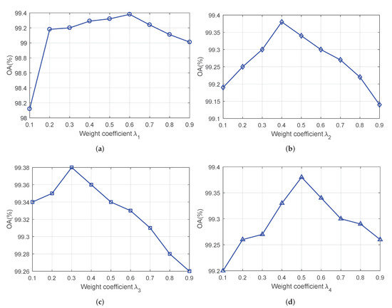 The coefficient : The OA versus the varying parameter is shown in Figure 2a, when we set , , and , and the increasing step for is 0.1. It indicates that when is greater than 0.6, the OA falls. The accuracy for is superior to the result at . Therefore, the coefficient should be set to 0.6 for this dataset.