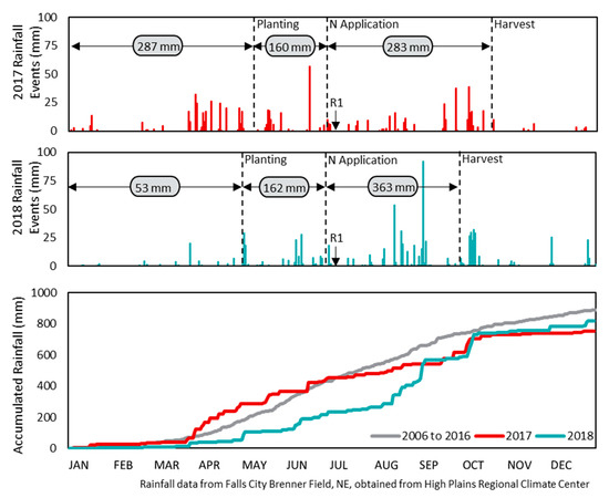 The study was conducted during the periods 2017 (17) and 2018 (18) on a total of three field sites in Richardson County in southeast Nebraska. All three sites were non-irrigated, planted in 0.762 m rows and had soybeans as the previous crop. Soil texture was predominantly silt loam and average site organic matter (OM) was 2.5 to 3.2 g kg−1. Soil characteristics and agronomic practices for the sites are provided in Tables S1 and S2. The cumulative precipitation from January 1 to flowering (4–5 July) in 2018 was only 235 mm, while in 2017 precipitation was 453 mm, similar to the corresponding long-term average (2006 to 2016) of 447 mm (Figure 1). Monthly air temperature is provided is Table S3.