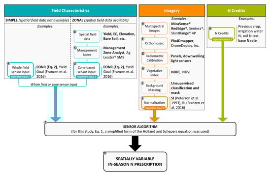 While much work has been done demonstrating that a UAV with passive multispectral sensors can detect N stress in cereal crops [53,58,59,60], little has been done to transform these multispectral sensor readings into a practical N recommendation system to be applied in commercial farming operations [61], thereby further contributing to the limited adoption of this technology. Therefore, the present work developed, implemented, and evaluated a practical system for transforming passive multispectral imagery collected with a UAV into a spatially variable, in-season N prescription. The proposed DSS also enables the incorporation of spatially variable field characteristics when data are available. The particular objectives of this research were: