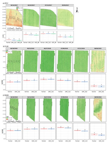 Normalized difference red edge (NDRE) data for UAV_84 (sensor-based treatment with 84 kg ha−1 base rate), UAV_112 (sensor-based treatment with 112 kg ha−1 base rate), and farmer-managed treatments at sites ZP17, YL18, and DA18. Top panel is NDRE imagery displayed with minimum-maximum stretch on a color ramp that encompasses the minimum and maximum value across imagery dates for that site. Bottom panel are NDRE means; different letters indicate means are significantly different from each other at p-value < 0.05. Vertical bars represent standard deviation. The vertical dashed line separates imagery collected before and after in-season application.