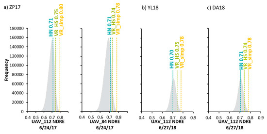 Histogram of frequency of NDRE values for UAV_112 and UAV_84 treatment strips for the imagery date immediately preceding the in-season N application. Histograms include all pixels (plant, soil, and shadow) in the image. Reference values for each reference method evaluated (VR_simp, VR_HS, and HN) are indicated in the histogram.