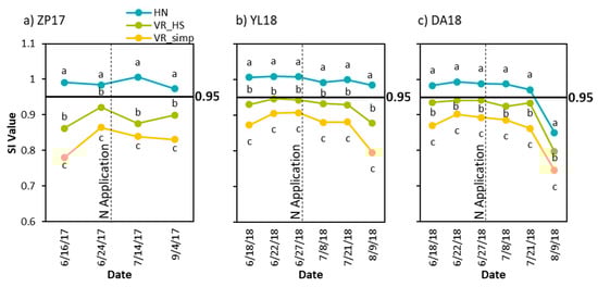 Comparison of sufficiency index (SI) calculated with two virtual reference (VR) methods (one utilizing the NDRE value at the 95 percent in the histogram [VR_simp], the other utilizing the cumulative 95th percentile [VR_HS]) and the high N reference (HN) method for UAV_112 treatment strips at three sites across numerous sensing dates. The 0.95 SI threshold is indicated with a solid black horizontal line. The date of in-season N application is represented with a vertical dashed line. Means denoted with different letters are significantly different within a sensing date at p-value < 0.0001.