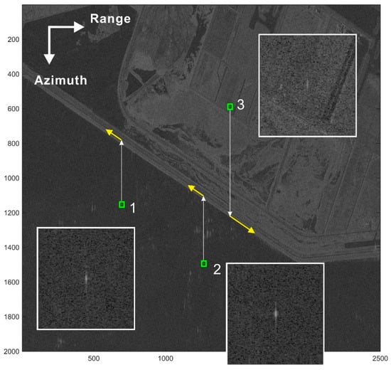 SAR SLC data acquired by TerraSAR-X strip-map mode were used to validate the proposed method. To obtain ground truth data, two truck-mounted corner reflectors were operated with a controlled speed along a straight coastal road during TerraSAR-X data acquisition, as seen in Figure 1. The speed-controlled trucks equipped with corner reflectors are denoted “1” and “2” (hereafter referred to as vehicle 1 and vehicle 2), respectively, in Figure 1. They had a common along-track velocity of −6.11 m/s, as listed in Table 2. The along-track velocity of the vehicle denoted “3” (hereafter referred to as vehicle 3) in Figure 1 was +10.11 m/s. Vehicle 3 was not equipped with a corner reflector. The negative sign of the along-track velocity represents the movement direction of the vehicle approaching the antenna, whereas the positive sign represents the direction away from the antenna. For more details concerning the field experiment, refer to [7]. The speed of the vehicle was measured by an onboard GPS system that recorded position and speed at a time-interval of one second. Although the GPS data interval of one second is sufficient to examine the average velocity of the moving target, it is not sufficiently short to analyse the instantaneous acceleration of the moving target. The antenna-integration time for the point target was approximately 0.7 s.