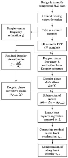 using only a few tens of azimuth samples around the target. There are various methods with which to estimate the quadratic phase term, such as a FrFT-based method in the time domain [31,37,38,47] or a Doppler-rate filter-bank method [9,25,29]. Both approaches search for a quadratic coefficient until the azimuth signals are optimally compressed. Minimum entropy is a popular criterion for optimal azimuth compression [39,40,41,48]. The sub-aperture method is also useful [13,27]; it does not require the criterion of optimal azimuth compression. However, the accuracy of the sub-aperture method is usually less than those of the FrFT or Doppler-rate, filter-bank-based methods. By applying a suitable method, the quadratic coefficient in Equation (12) can be estimated independently. The detailed discussion of these methods is beyond the scope of this research. The second term in the bracket of Equation (13) is less than the order of 10−3 and is negligible. As in Equation (8), the residual Doppler rate is usually dominated by the along-track velocity , provided there is a constant across-track velocity, and consequently, the along-track velocity can be retrieved from the estimate with the assumption of negligible across-track acceleration. However, as discussed in [10], it is difficult to separate the along-track velocity from the across-track acceleration if the across-track acceleration is significant from single or dual-channel SAR observation. While most applications are interested in the along-track and across-track velocity components , the non-negligible across-track acceleration frequently causes serious errors in along-track velocity estimation. It might not be possible to separate the distribution of the estimate in Equation (8) from that of without additional observations if the across-track velocity increase is ideally linear with a constant , as discussed in [10]. However, the variation in across-track velocity is not always linear in reality. In this paper, we show that the time variation in can be measured in the Doppler-frequency domain, and the measured time variation in is used for compensation of the over or under-estimation of the along-track velocity , initially calculated from the estimate with the assumption of a zero across-track acceleration.