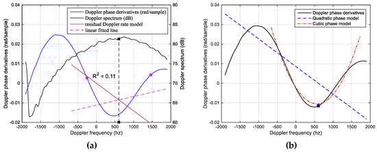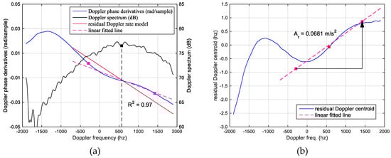 From the residual Doppler rate estimated in time, a linear phase model in the Doppler frequency domain is given by Equation (15), and it is subtracted from the Doppler phase derivatives, as in Equation (16).
