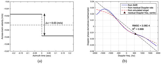 All parameters for the simulation were adopted from the actual data from header information or estimated data from the SLC data used: the system and residual Doppler rate were 5438.1 and −11.2 Hz/s, respectively, with a PRF of 3815.5 Hz. Raw signals were simulated first, and then a general azimuth compression was applied to simulate the SLC data. As shown in Figure 4b, the Doppler phase derivatives obtained from the velocity jump model (red dashed line) match very well with that of the actual SAR data (blue solid line) with a squared correlation coefficient of 0.999. On the contrary, linear velocity increase or decrease models simply change the slope of the straight line, which does not account for the actual velocity variation pattern in Figure 4b.
