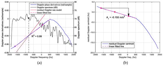 The quadratic phase in Equation (12) is the residual Doppler rate caused by the azimuth velocity and across-track acceleration. After estimation of the residual Doppler rate coefficient, the average slope in the Doppler-frequency domain is given by
