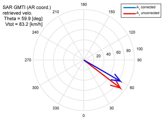 The improvement by adopting the proposed method is obvious, as summarized by the two resulting velocity vectors in Figure 6. The ground truth along-track velocity was 10.11 m/s. While the initial estimate of the along-track velocity was 15.38 m/s without acceleration compensation, the along-track velocity was reduced to 11.60 m/s after applying the proposed acceleration compensation. Through the acceleration compensation, the total velocity reduced from 25.2 m/s (90.8 km/h) to 23.1 m/s (83.2 km/h). With correction of the along-track velocity, the heading direction was adjusted by 7.5° and became parallel to the road. An improved heading direction provides very useful information for the interpretation of ground moving targets when compared with roads or other ground structures.