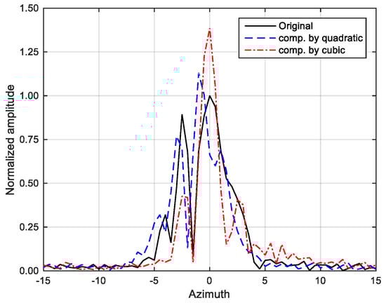 The values of the original model and the model with the removed quadratic-phase signals in Figure 8 are 2.646 and 2.627, respectively, which implies that the residual compression by the optimal quadratic-phase model is not large. On the contrary, the entropy significantly reduced to 2.148 after the residual compression by the cubic-phase model, as seen in Figure 8. The original SLC signals rendered two peaks around the centre of the target. The residual compression by the quadratic-phase model slightly reduced the left peak, while increasing the right peak; however, it remains unclear whether there are two peaks or one peak with asymmetric side-lobes. After the residual compression by the cubic-phase model, it is clear that the target consists of one point target in the shape of typical sinc function. The results strongly support that the along-track acceleration was dominant at moment of SAR observation, while the across-track acceleration was not significant. Since the residual compression was done by a cubic-phase model, there exists asymmetry of the second and higher-order side-lobes, as discussed in [7].