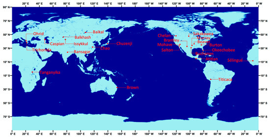 Geographic locations of 24 selected lakes across the globe.