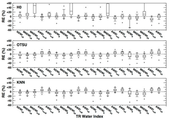 Boxplots of relative errors of the Landsat-extracted water body areas versus water indices computed from the top-of-atmosphere (TOA) reflectance corresponding to three different image classification methods (H0, Otsu, and k-nearest neighbor (KNN)).