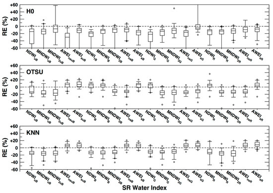 Boxplots of relative errors of the Landsat-extracted water body areas versus water indices computed from the surface reflectance corresponding to three different image classification methods (H0, Otsu, and KNN).