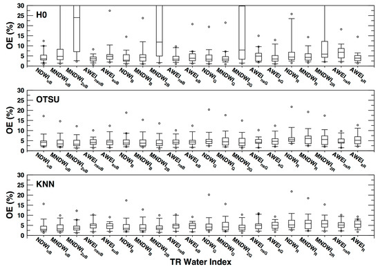 Boxplots of overall image classification errors versus the TR water index corresponding to three different image classification methods (H0, Otsu, and KNN).