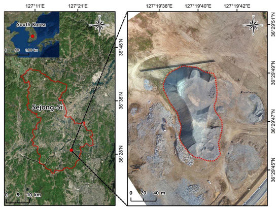 A site for waste stockpiles in Jipyeon-ri in Sejong City, South Korea was selected as the study area. Sejong City is a planned city in which large construction sites and residential areas coexist. Excavated earth materials and construction wastes are stored at a temporary waste disposal site, damaging the landscape and posing problems to residential areas via wind-blown dust. Construction site waste management is, therefore, a compelling issue, and accurate waste volume computation is important for the waste removal plan. The waste disposal site selected as the study area extends over ~6000 m2, containing a significant volume of waste, which is challenging to measure. The peak waste mound height is approximately 20 m spreading over a 130 m × 90 m surface area. Wastes are mostly from construction sites and include concrete, slag, and sand. Due to the limited access to the mound featuring uneven surfaces, measurements were taken using a ladder in this study (Figure 1).