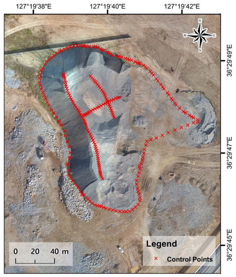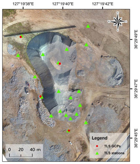 TLS-based point cloud generation has applications in numerous fields (e.g., industry, forestry, and academic research) [3,4,5,6,7]. Pitkänen et al. [3] employed TLS in stem diameter measurements for a more accurate volume estimation, while Liu et al. [4] measured leaf angle distribution affecting the flux of radiation, carbon, and water. Cultural heritage sites or buildings can be represented as point clouds for observation or monitoring purposes [5,8]. Xu et al. [9] utilized TLS to monitor the annual surface elevation of glaciers and their accurate boundary measurements. Osada et al. [10] proposed a method to minimize the Global Navigation Satellite System (GNSS) measurements in places such as city corridors where GNSS signals are weak. The TLS method has been intensively employed due to its ability to generate high-accuracy data with dense TLS-based three-dimensional (3-D) point clouds [6,11]. This method, however, is suboptimal (in terms of utility) due to its high cost and time consumption [12]. There are numerous limitations with respect to monitoring waste stockpiles using TLS at project sites located in areas of danger, such as mountainous areas, where access is poor due to surrounding environmental features [13]. The danger intensifies as people approach the waste mounds. Wastes create unpredictable landscapes that are difficult to walk on and may cause respiratory or skin problems depending on their type. Due to the limited access on foot, a ladder is used to reach the waste mound top and place ground control points (GCPs).