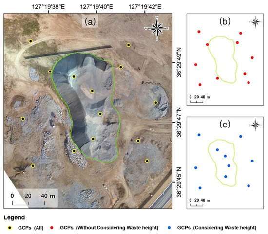 Ground control point (GCP) positions: (a) all GCPs, (b) GCPs placed without considering waste height, and (c) GCPs placed considering waste height.