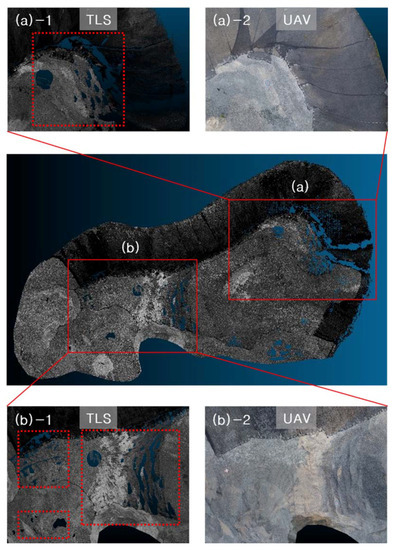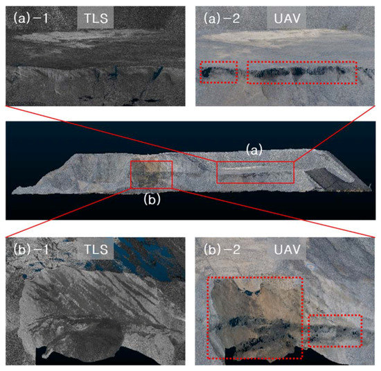 Figure 6a,b shows the top-view images comparing the TLS- and UAV-based point clouds of the waste disposal site.