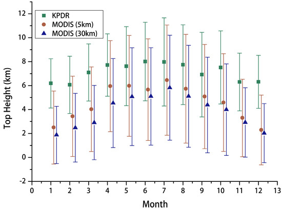 From 2014 to 2017, about 4000 valid MODIS CTHs (> 0) are obtained from the area within 5 km, and 30 km of the IAP, respectively. The monthly distributions of CTHs, derived from MODIS and KPDR, are presented in Figure 1. The value of the KPDR CTH, hereinafter, is termed Hr and the value of MODIS CTH is termed Hm. It is shown that all of the monthly Hm values, including those averaged in the 5 km area and 30 km area, are lower than the monthly Hr values. In each month, the mean Hr is greater than 6 km, and summer (June to August) has a higher CTH than other seasons. The mean Hm in each month is lower than 6 km and decreases by 1–3 km relative to Hr. The standard deviation (STD) of Hm is higher than that of Hr, indicating a larger range of variation. A raw comparison based on monthly statistics shows that there is an obvious discrepancy (>2 km) between Hr and Hm. One reason behind such a discrepancy is that the temporal resolution of the two datasets is different. Besides, it will also be associated with the uncertainties in CTH retrieval.