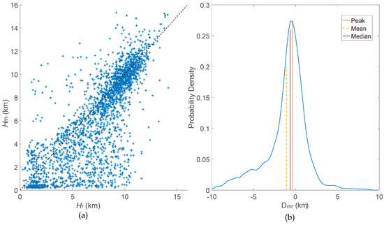 All CTH comparisons collocated from MODIS and KPDR (a) and the distribution of their differences Dmr (b). The mean Dmr and median Dmr are indicated with different lines.