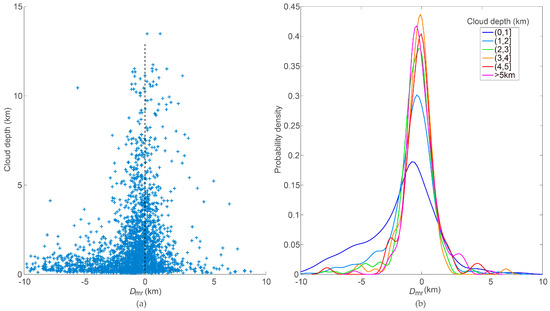 It is apparent that the value of Dmr relates closely to the cloud depth (Figure 3a). For thin clouds (cloud depth <1 km), Dmr occurs between −12 and 9 km. However, when the clouds become thicker, especially larger than 2 km, the Dmr range narrows considerably toward zero. For comparisons of cloud depth > 1 km (47% of all comparisons), the mean Dmr is −0.47 ± 1.68 km. Table 3 shows the statistical results of Dmr in different cloud depth ranges.