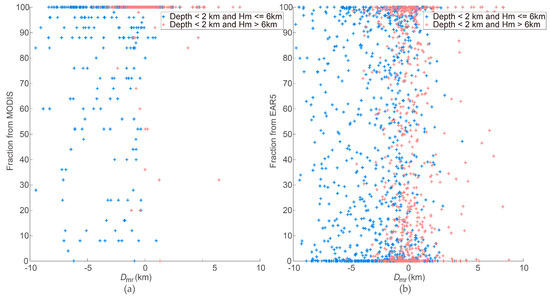 Two cloud fraction datasets (MODIS cloud fraction and ERA5 cloud fraction) are used to investigate the relationship between cloud fraction and Dmr (see Figure 5). Since large differences are mostly from clouds with low depth, only collocations with cloud depths of <2 km are presented in Figure 5. The number of accessible MODIS cloud fraction data is less than the ERA5 cloud fraction data, meaning there are fewer points in Figure 5a than in Figure 5b. In spite of this, the scatterplots based on the two datasets all show that Dmr is not closely correlated with the cloud fraction, although statistical analysis based on both fraction datasets shows that the mean difference (−1.06 ± 2.50 km) for cloud fraction >50% is a little higher than the mean difference (−1.15 ± 2.63 km) for cloud fraction <50%.