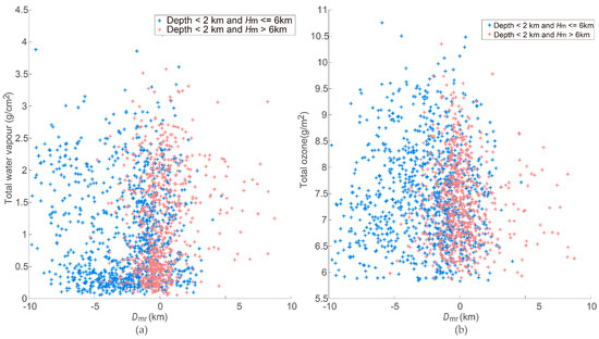 TWV and ozone are two important parameters determining clear-sky infrared temperature brightness due to their absorptions in infrared band. Collocations with depths of <2 km have relatively large Dmr and are compared to investigate the possible influences. As shown in Figure 7a, the points are scattered “everywhere” and Dmr is not sensitive to the TWV. Here, the relevance of TWV in Dmr is unobvious. In Figure 7b, the Dmr values get slowly closer to zero as total ozone gets higher, and there is a weak decline in the tendency of the discrepancy as total ozone increases.